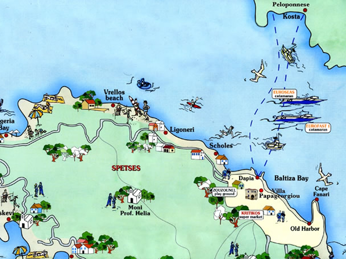 This journey takes approx 2.5 to 3 hours. Once on Spetses it is possible to rent motor bikes and mountain bikes to explore the island or take the boats from the main harbour to the various beaches. In addition there is a bus service from the town beach to Anaghiri and back.